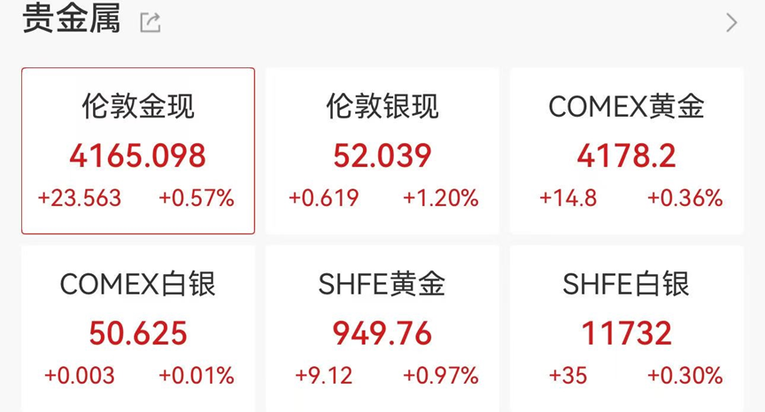 10月14日,现货黄金(伦敦金现)盘中一度突破4170美元/盎司关口,随后有所回落。白银价格也出现大幅波动,现货白银(伦敦银现)14日盘中一度突破53美元/盎司关口创出历史新高,随后一度失守51美元/盎司。截至北京时间10月15日7时40分,伦敦金现报4165.098美元/盎司,日内涨0.57%;伦敦银现报52.039美元/盎司,日内涨1.2%。