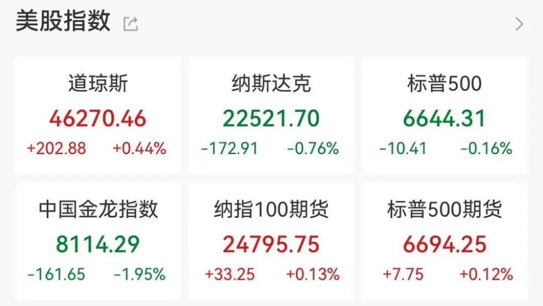 当地时间10月14日周二,美股三大指数涨跌不一。截至收盘,道指涨202.88点,涨幅为0.44%,报46270.46点;纳指跌172.91点,跌幅为0.76%,报22521.70点;标普500指数跌10.41点,跌幅为0.16%,报6644.31点。